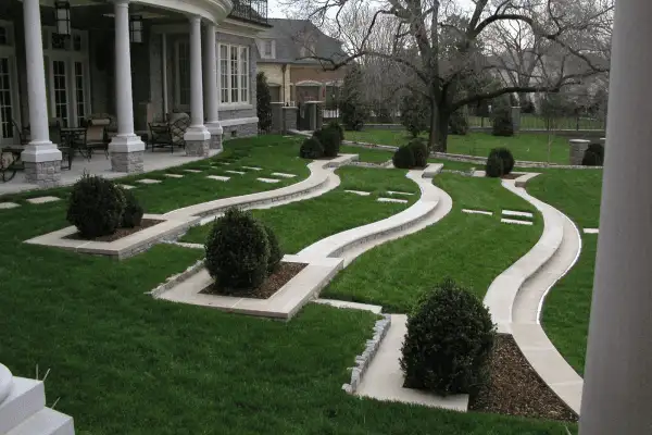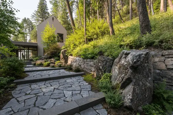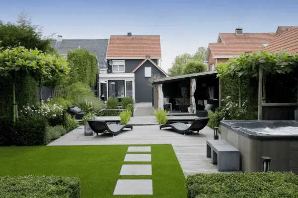 Landscaping, even when done minimally, helps to soften the space and create a relaxing atmosphere.